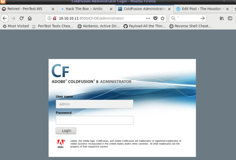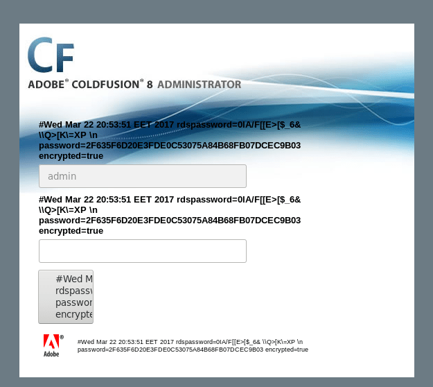 We have ourselves a ColdFusion administrator login page. We can see that the username field is grayed-out and pre-filled with ‘admin’.