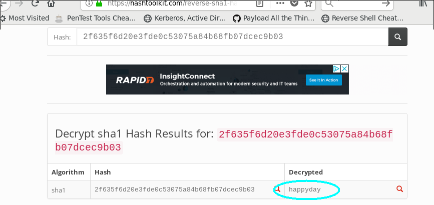 Ok let’s give SHA-1 a try. Before jumping directly into hashcat or JohntheRipper, it’s often quicker to simply Google the hash and see if it has been posted cracked/posted online before. In this case we get lucky with this exact scenario: