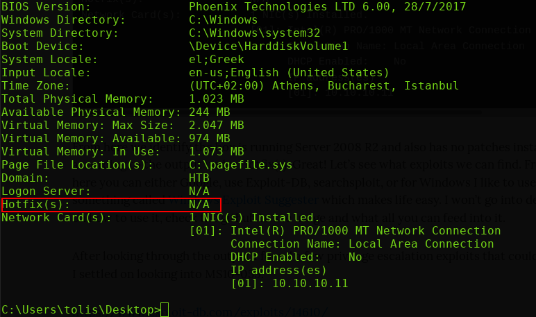 Another incredibly useful feature of the systeminfo command is the ability to enumerate which patches/hotfixes are installed on the machine. In this case, there are none! This is a completely unpatched version of Windows Server 2008 R2.