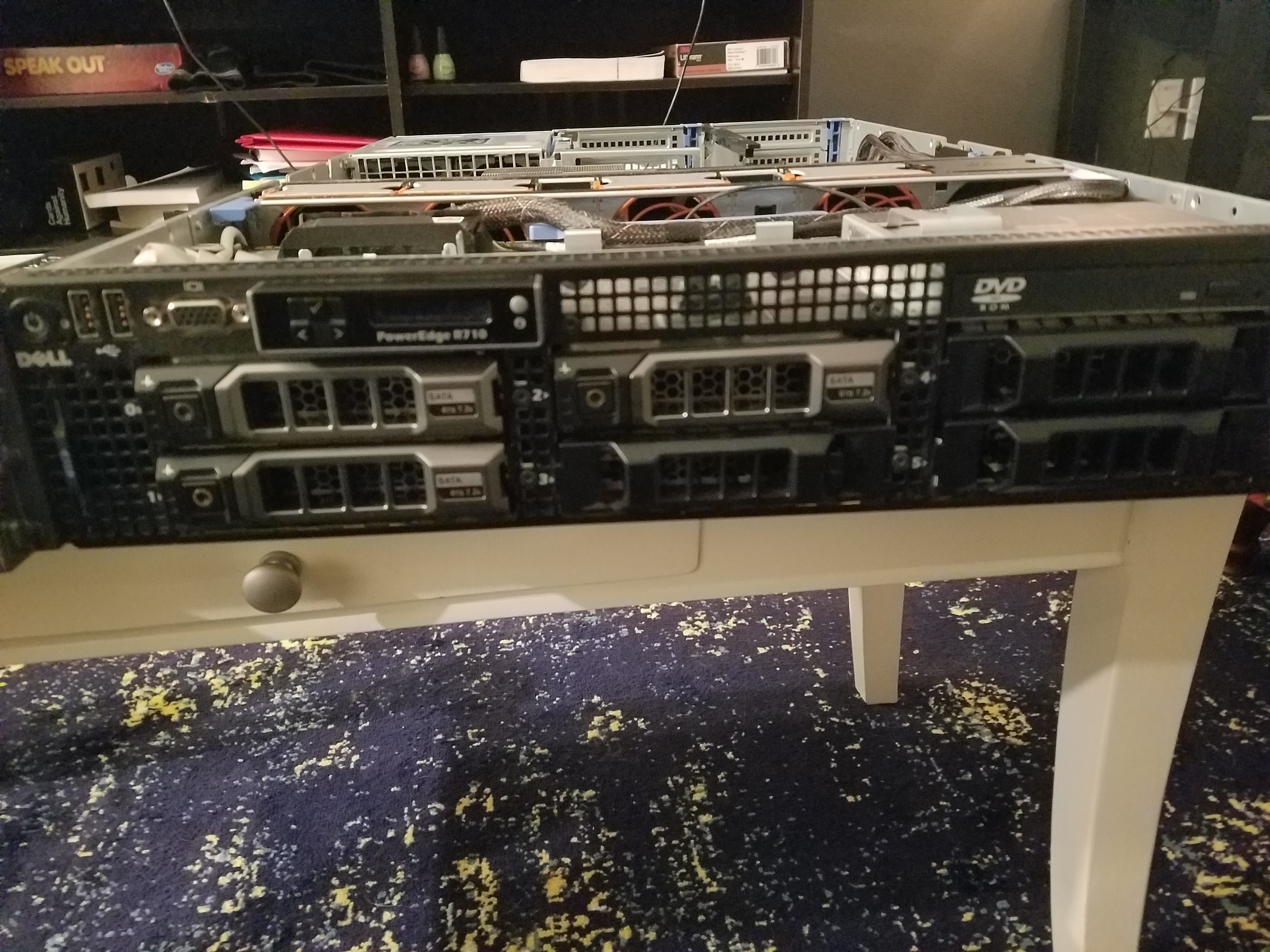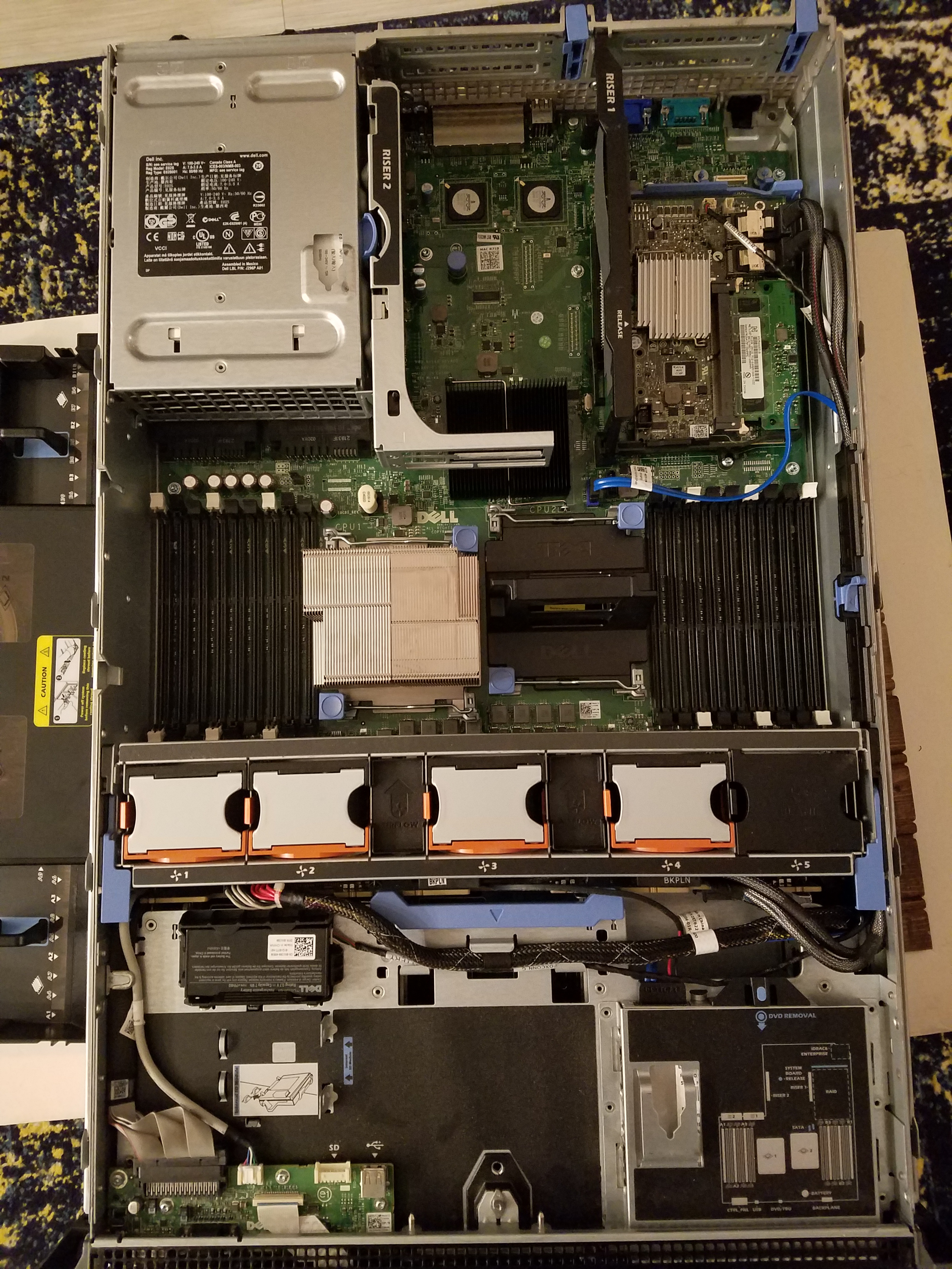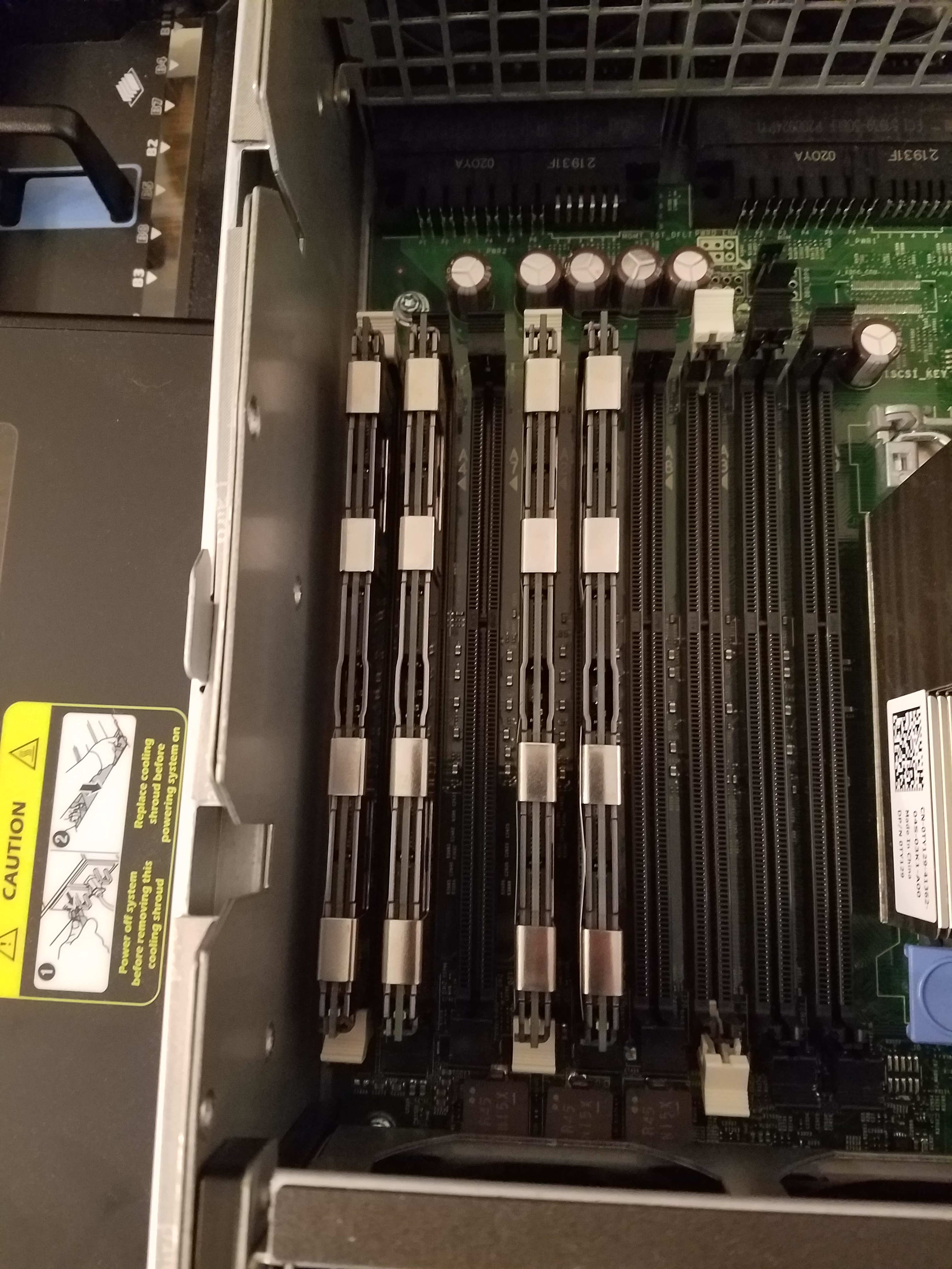 The 6 blue sticks at the top of the picture was the previous owner’s RAM. But they were only 2 GB UDIMMs. The memory I purchased was RDIMM, and the two are not compatible in the same machine, so I had to pull them from the server.