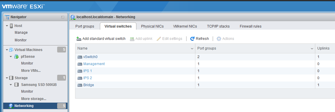 For information on how I created and segmented the virtual network, check out my post on “My Virtual Lab Environment”. Configuring your network settings is easily done via the ‘Networking’ tab in ESXI. Here you can see I’ve created 5 virtual switches.
