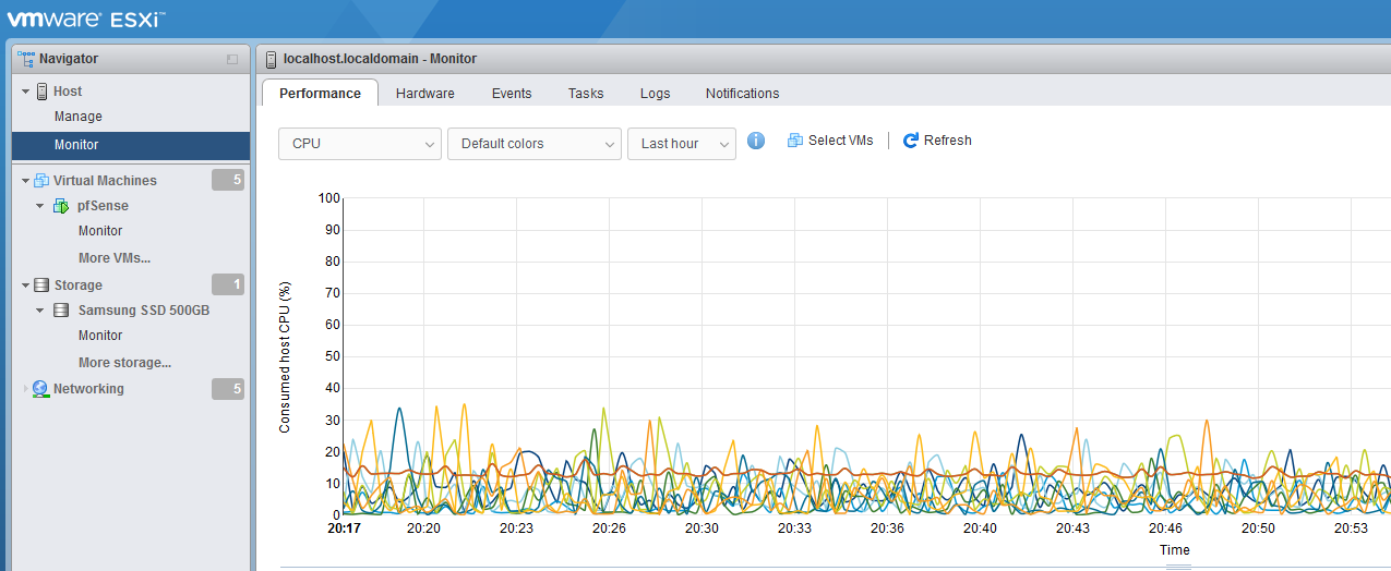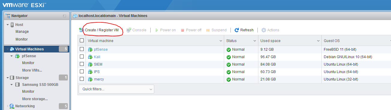 Provisioning a VM in ESXI is as simple as clicking the ‘Create / Register VM’ button, and running through the configuration steps. You can easily upload ISO files from your desktop computer to the server through this web interface as well, which is very handy.