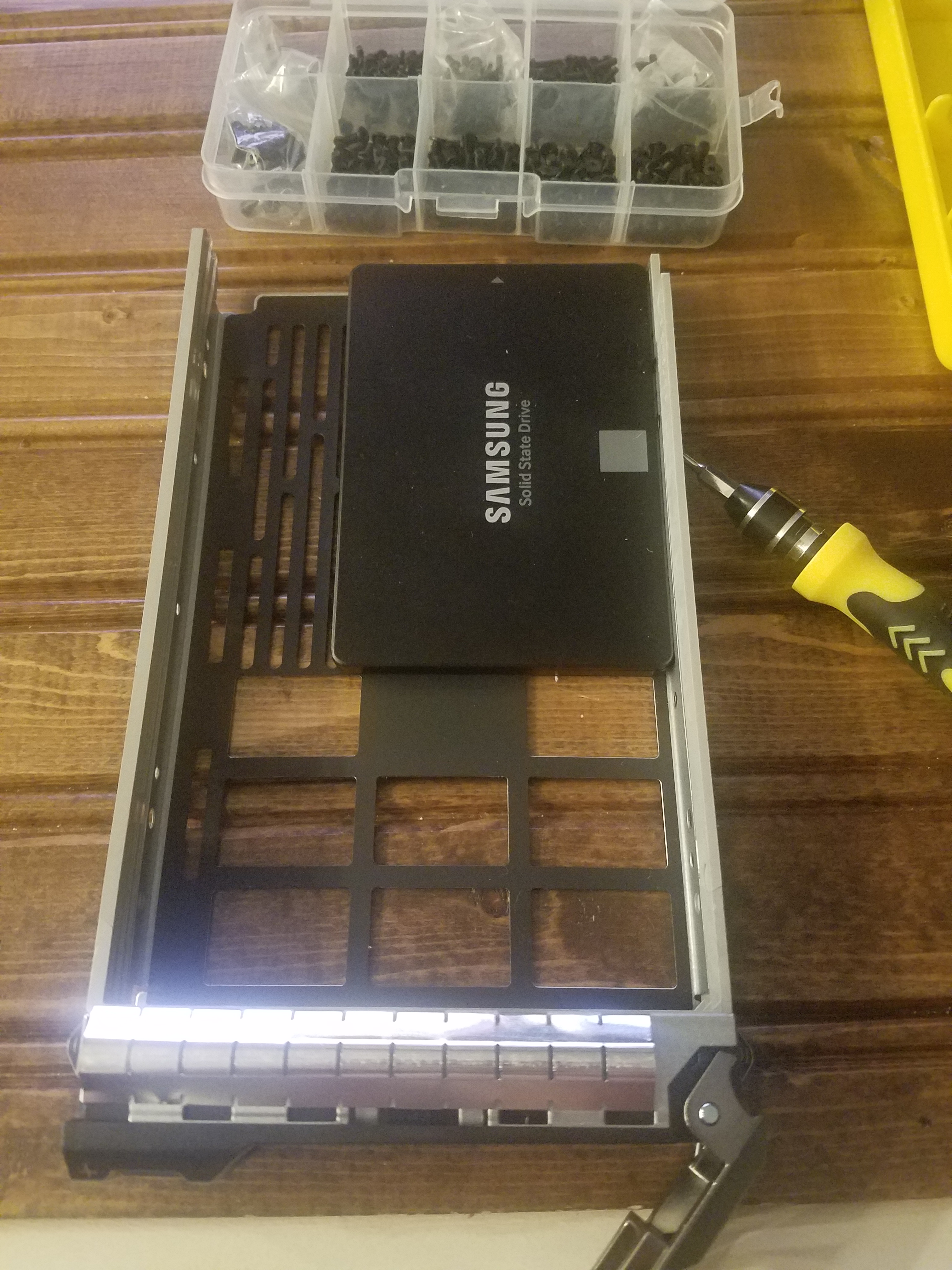 Once the RAM was installed, I mounted the SSD into the first drive bay. As you can see from the picture below, this bay was clearly meant to house a larger, mechanical hard drive, but mounting the SSD into the side works just fine.