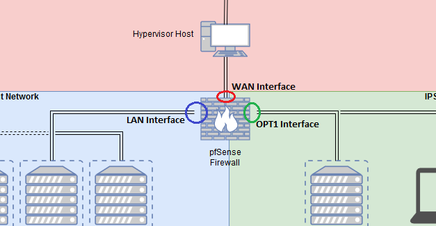 Serving as the focal point of our network, we can see the pfSense Firewall sitting at the intersection of 3 networks. pfSense is actually much more than just a firewall, as it also serves as a fully-functional router and gateway to the Internet for our VMs.